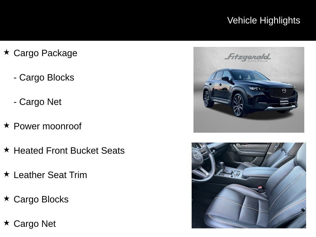 2023 Jet Black Mica Mazda CX-50 6-Speed Automatic Cargo Blocks, Cargo Net, Cargo Package, Heated Front Bucket Seats, Leather Seat Trim, Power moonroof. 2.5L I4 Turbocharged DOHC 16V LEV3-ULEV125 227hp 2.5 Turbo You will love our NO HAGGLE, NO HASSLE PRICING here at Fitzgerald Auto Mall. Ask us about our BUYER PROTECTION PLAN, LOANER CAR PROGRAMS, AND FREE Vehicle History Report. Can not find what you want?? NO PROBLEM! We have over 1,000 Pre-Owned vehicles available at WWW.FITZMALL.COM. You can also visit us in person at 114 Baughmans Lane Frederick MD, 21702 or Call Us @240-629-7301.