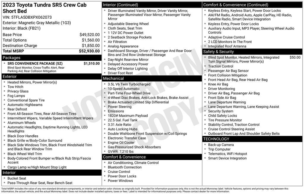 SR5 Convenience Package - Includes Blind Spot Monitor (BSM), Front and Rear Parking Assist with Automatic Braking, and large fuel tank (32.2 gallons)