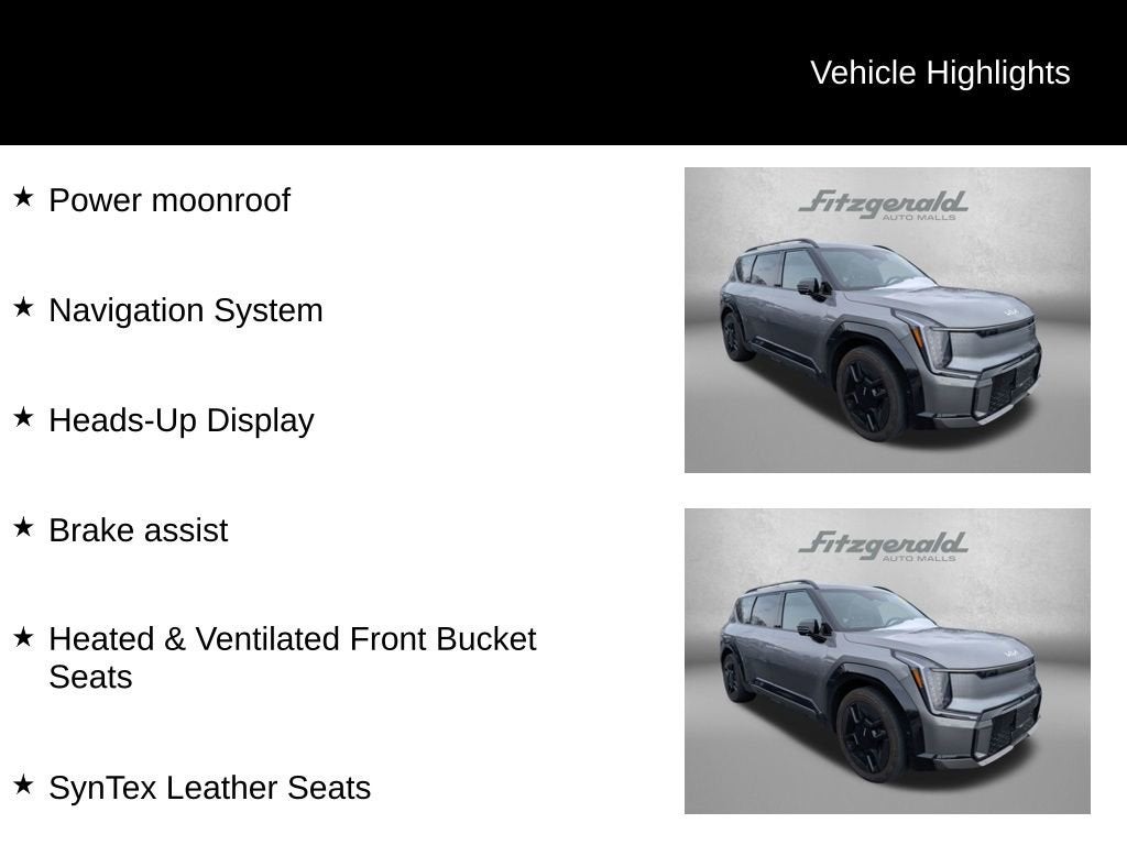 2024 Pebble Gray Kia EV9 1-Speed Automatic Brake assist, Heads-Up Display, Heated & Ventilated Front Bucket Seats, Navigation System, Power moonroof, SynTex Leather Seats. Electric Motor GT-Line You will love our NO HAGGLE, NO HASSLE PRICING here at Fitzgerald Auto Mall. Ask us about our BUYER PROTECTION PLAN, LOANER CAR PROGRAMS, AND FREE Vehicle History Report. Can not find what you want?? NO PROBLEM! We have over 1,000 Pre-Owned vehicles available at WWW.FITZMALL.COM. You can also visit us in person at 114 Baughmans Lane Frederick MD, 21702 or Call Us @240-629-7301.